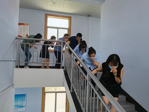 理論培訓(xùn)后進行火災(zāi)疏散演練,參加培訓(xùn)人員在楊教官的指引下,用濕毛巾捂住口鼻,彎腰貼墻迅速有序通過安全出口,奔向辦公樓前空地集合。